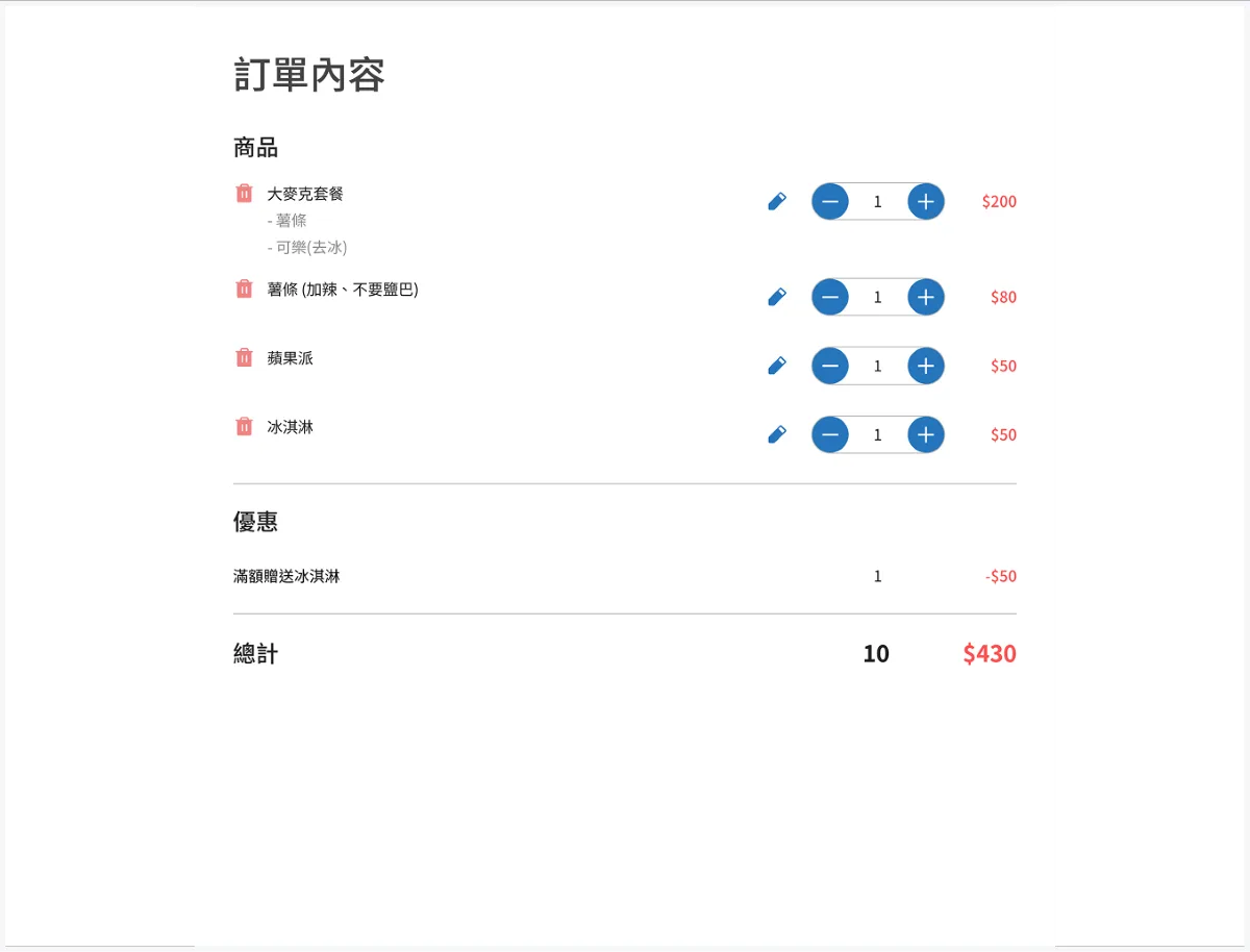 透過購物車一覽目前點選品項,顧客送出前,快速確認餐點及數量。