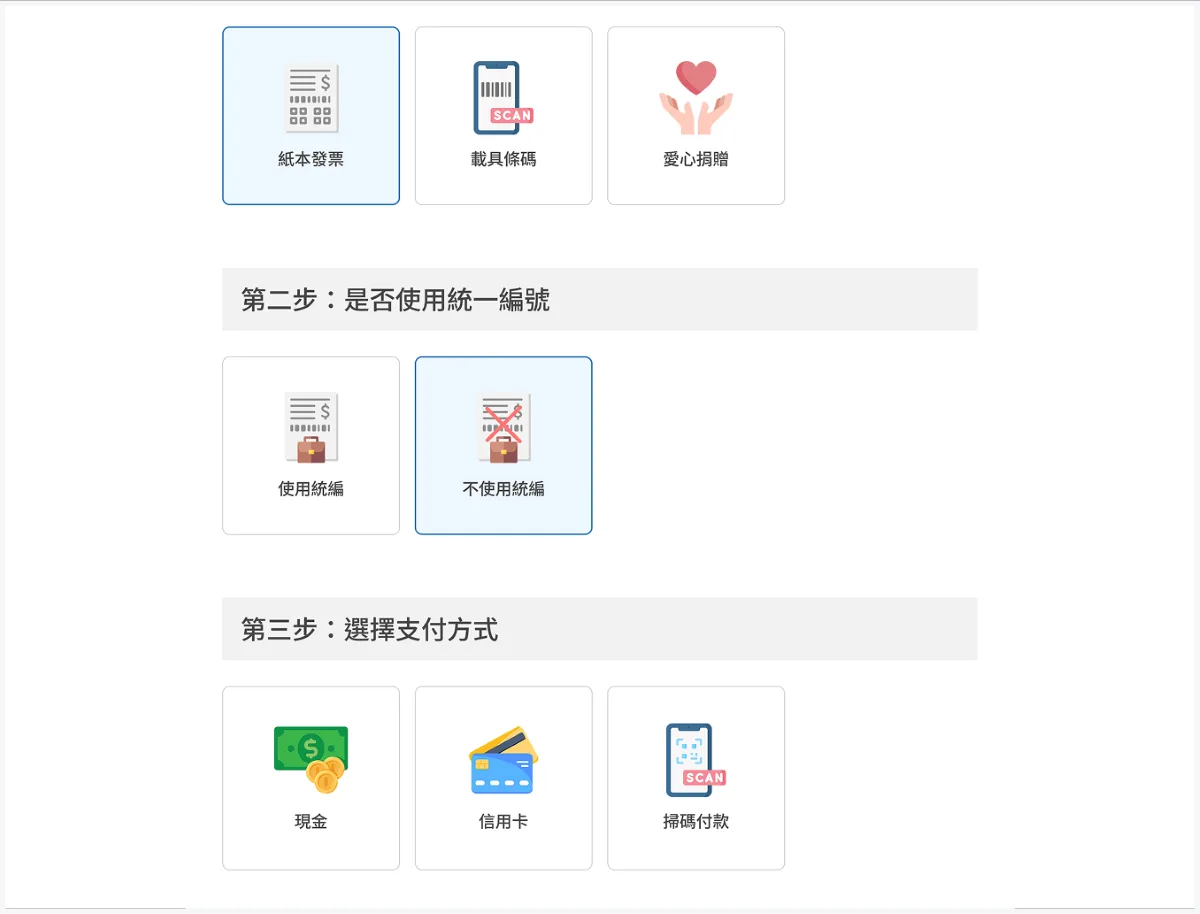 結帳時依序選擇發票開立形式、是否存入載具以及支付工具。