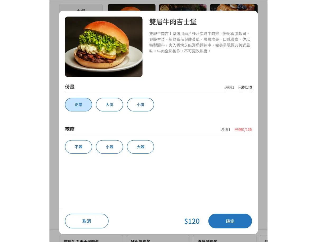 每份餐點或飲料提供可調整的選項,並支援設定口味選擇上限。