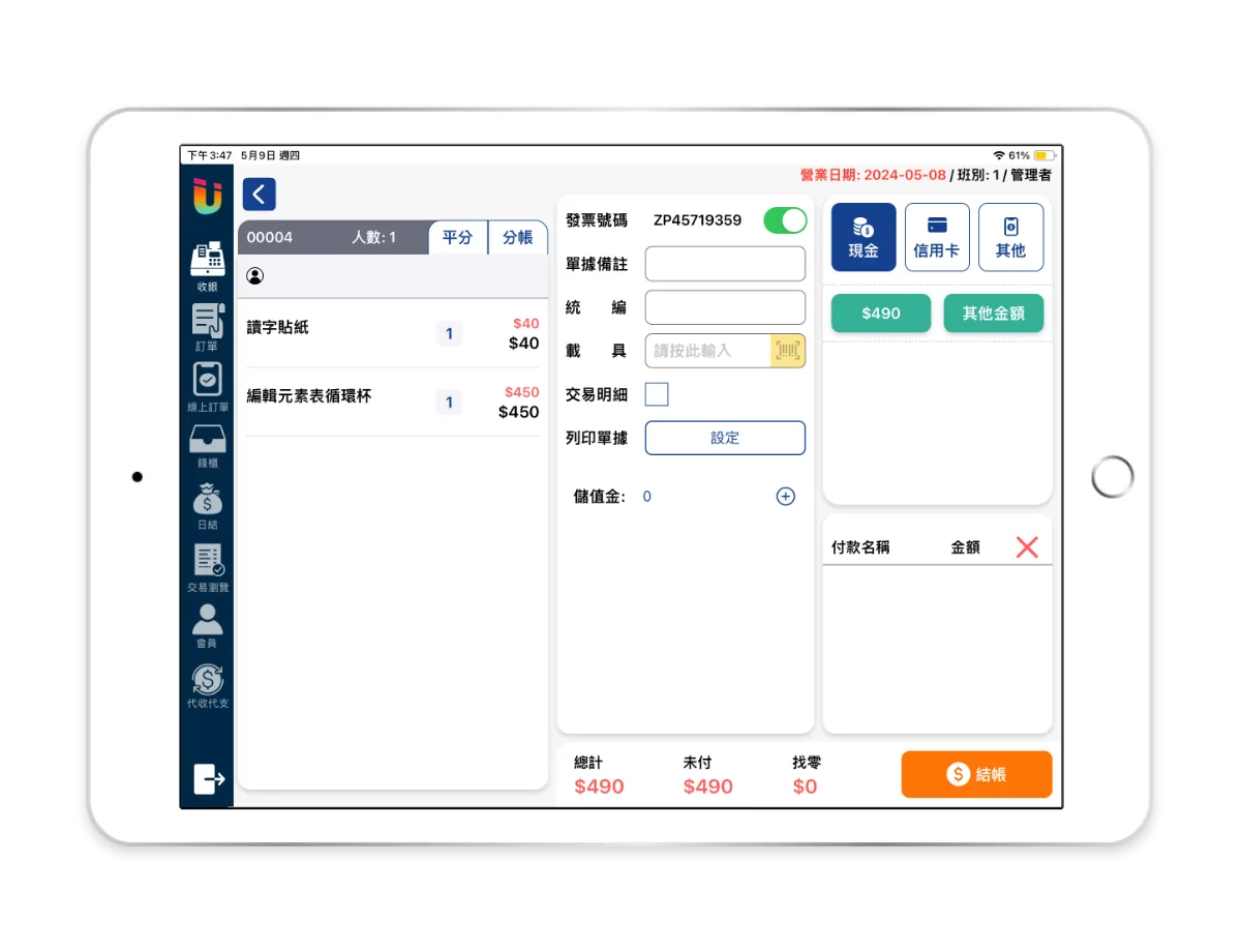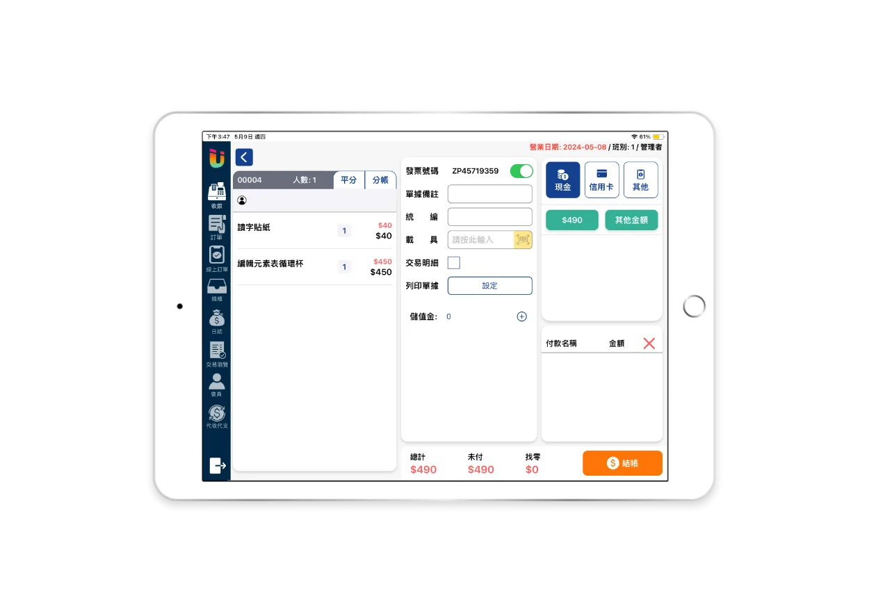 提供刷卡、付現、LINE PAY、Apple Pay 等收款方式,提升結帳便利性,避免因付款不便而放棄消費的情況。